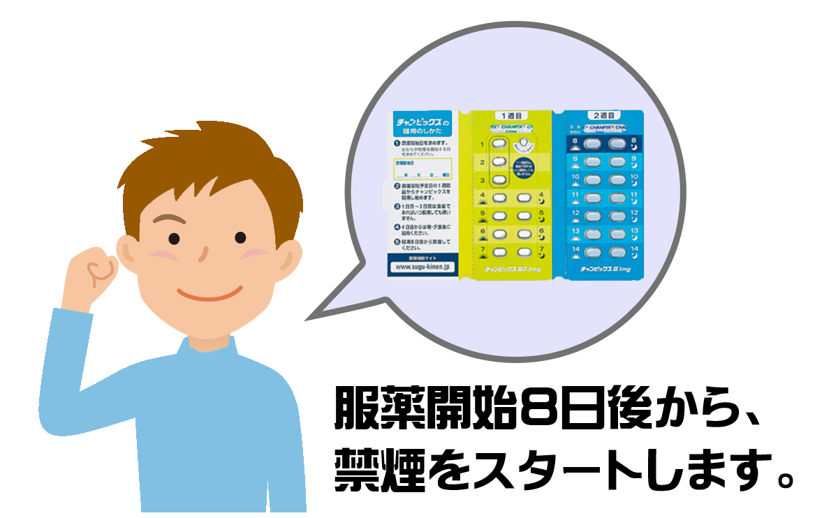 いきなり禁煙(煙草を我慢)するのではなく、服薬開始8日後から禁煙開始するため、無理なく禁煙がスタートできます。